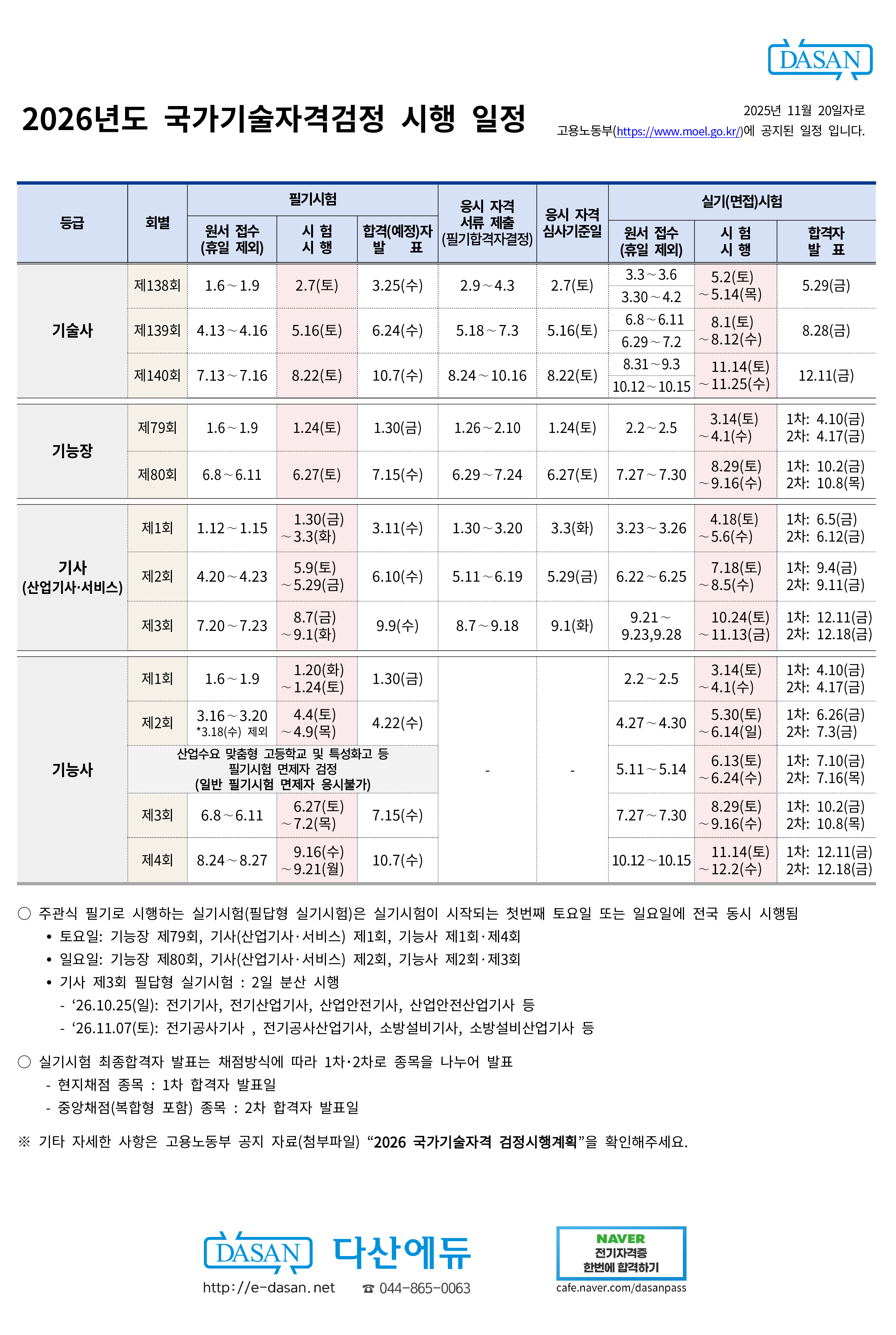 2026년 국가기술자격 시험일정이 발표되었습니다.